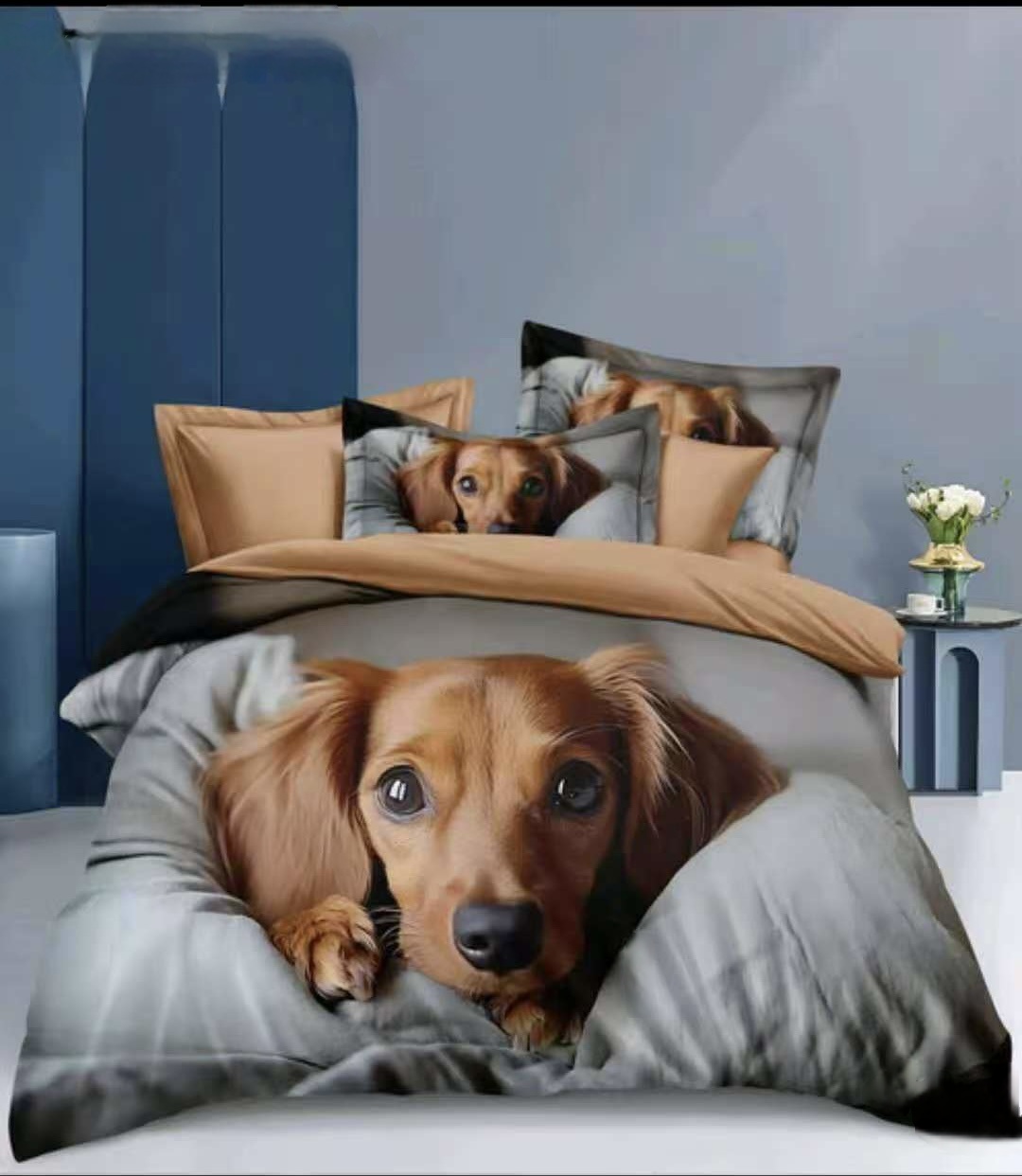 Potisk je z jedné strany – realistický 3D motiv roztomilých štěňat v košíčku, druhá strana je jednobarevná, ideální pro klidnější vzhled ložnice.